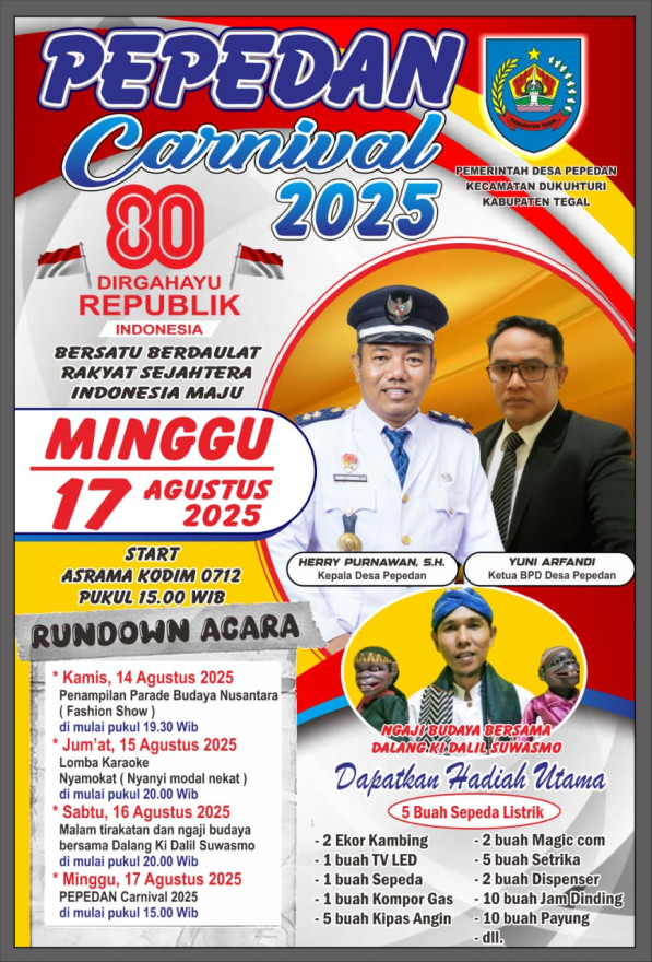 Dalam rangkaian perayaan Hari Ulang Tahun Kemerdekaan Republik Indonesia ke-80, Desa Pepedan menggelar acara penyerahan hadiah pada Minggu, 17 Agustus 2025. Kegiatan ini menjadi penutup sekaligus puncak kemeriahan setelah berbagai lomba dan karnaval sukses dilaksanakan dengan antusiasme tinggi dari masyarakat.